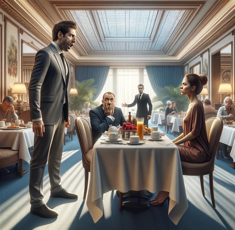 Dalle parole si passa ai fatti, e il nostro protagonista, in preda a un misto di rabbia e incredulità, decide che è il momento di lasciare il segno, letteralmente. La zuffa scoppia, trasformando la sala colazioni in un ring improvvisato, dove i colpi bassi non sono solo metaforici.