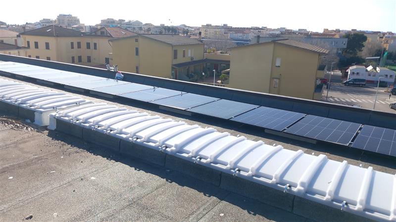 - l’intervento prevede l’installazione di pannelli solari fotovoltaici con annesso sistema di accumulo per assorbire e/o limitare i costi derivanti dall’illuminazione e dall’uso delle pompe di calore per produzione ACS; Sono installati impianti solari fotovoltaici connessi alla rete elettrica, garantendo la cessione in favore del Gestore dei servizi energetici (GSE) dell'energia non auto consumata in sito.Il campo fotovoltaico e i collettori solari sono collocati in aderenza su copertura rivolti verso sud nella miglior esposizione possibile lontano da possibili schermature. La collocazione prossima al locale tecnico farà sì che le tubazioni e i cablaggi non si ramifichino eccessivamente così da ridurre al minimo qualsiasi dispersione. Nel locale tecnico sono collocati gli scaldacqua a pompa di calore con accumulo integrato, l’inverter fotovoltaico e il pacco batterie. L’impatto visivo risulta limitato in quanto i pannelli dallo spessore esiguo risultano collocati a circa 9.05m di altezza.