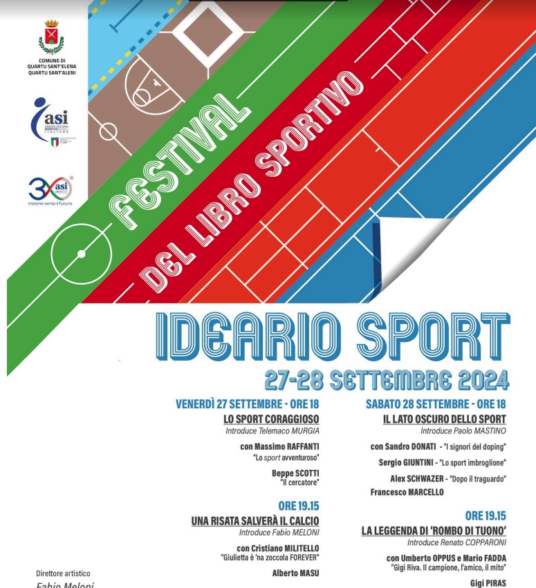 Doping nello Sport e Gigi Riva saranno gli argomenti della seconda giornata terza tappa di “Ideario Sport - Festival del libro sportivo”, organizzato dal Comitato regionale dell’ente di promozione sociale e sportiva ASI, in collaborazione con l’Associazione culturale Ideario e il Comune di Quartu Sant’Elena, ospitato venerdì 27 e sabato 28 settembre nell’Antica Casa Olla (via Eligio Porcu 29) a Quartu Sant’Elena. Con la direzione artistica di Fabio Meloni e il patrocinio di Coni Sardegna e Ussi Sardegna, “Ideario Sport” intende promuovere e valorizzare le opere della letteratura sportiva, raccontando lo sport, le azioni e le imprese di atleti e campioni, le vicende sportive e personali, i valori e gli esempi, i lati oscuri, oltre alle personalità di uomini e donne che sono entrati nella memoria grazie alle loro gesta sportive.